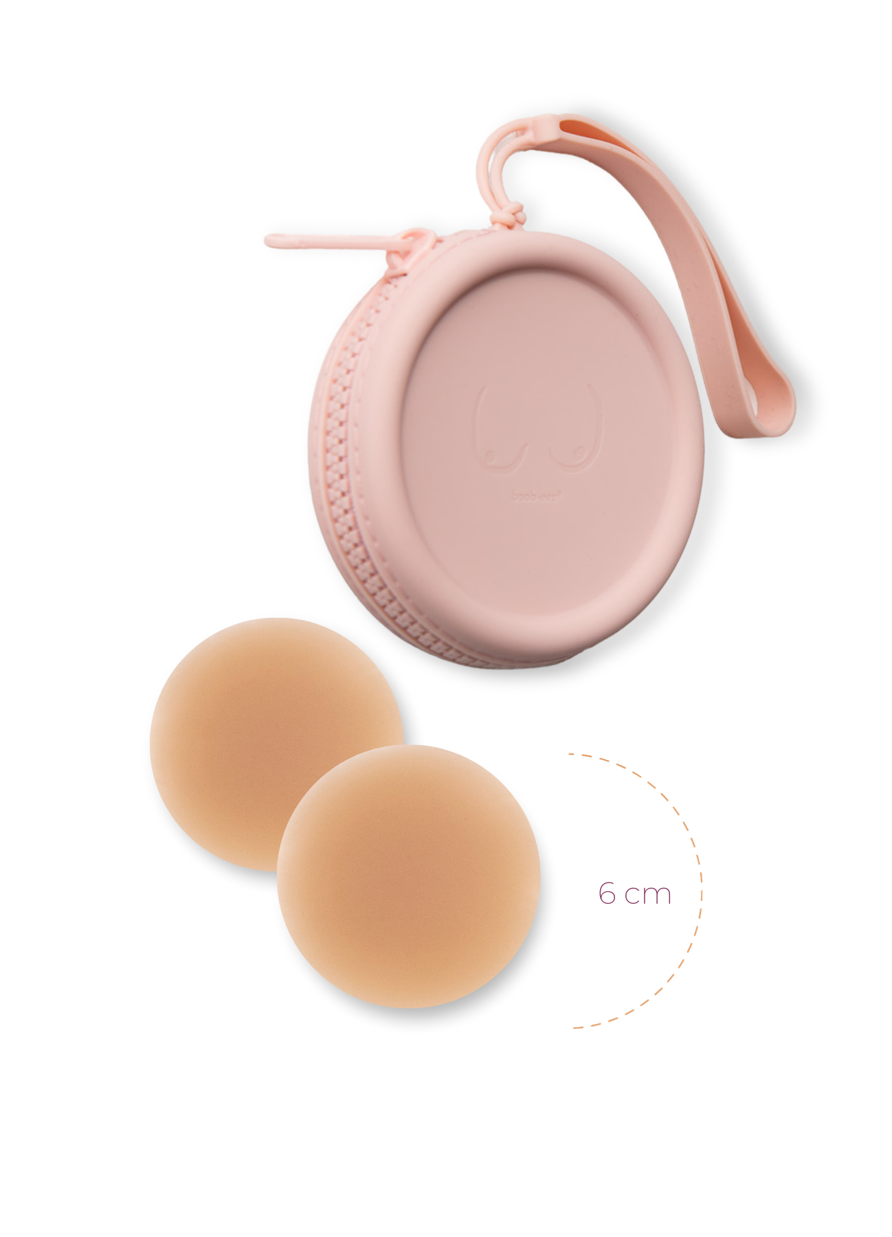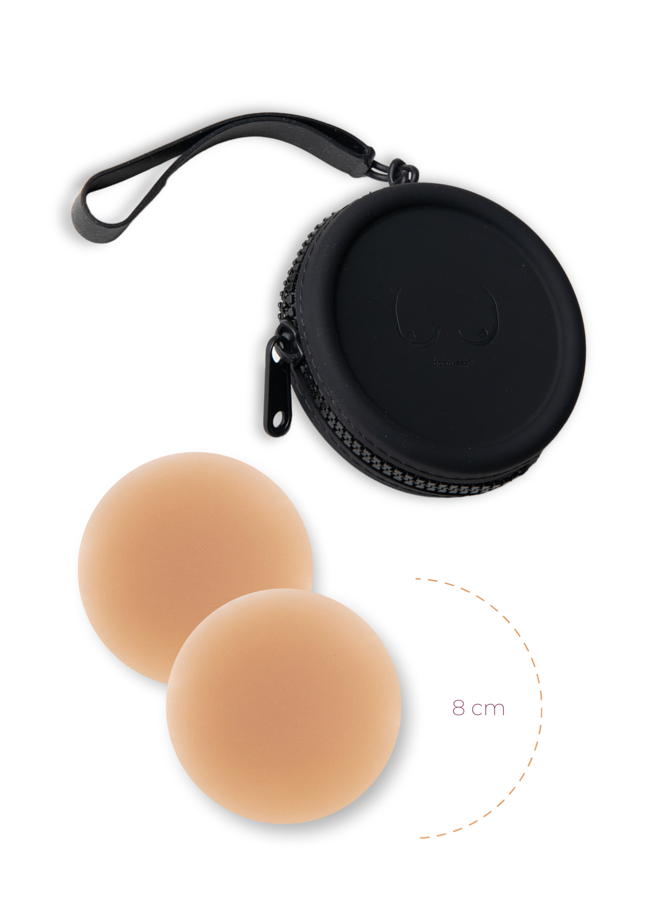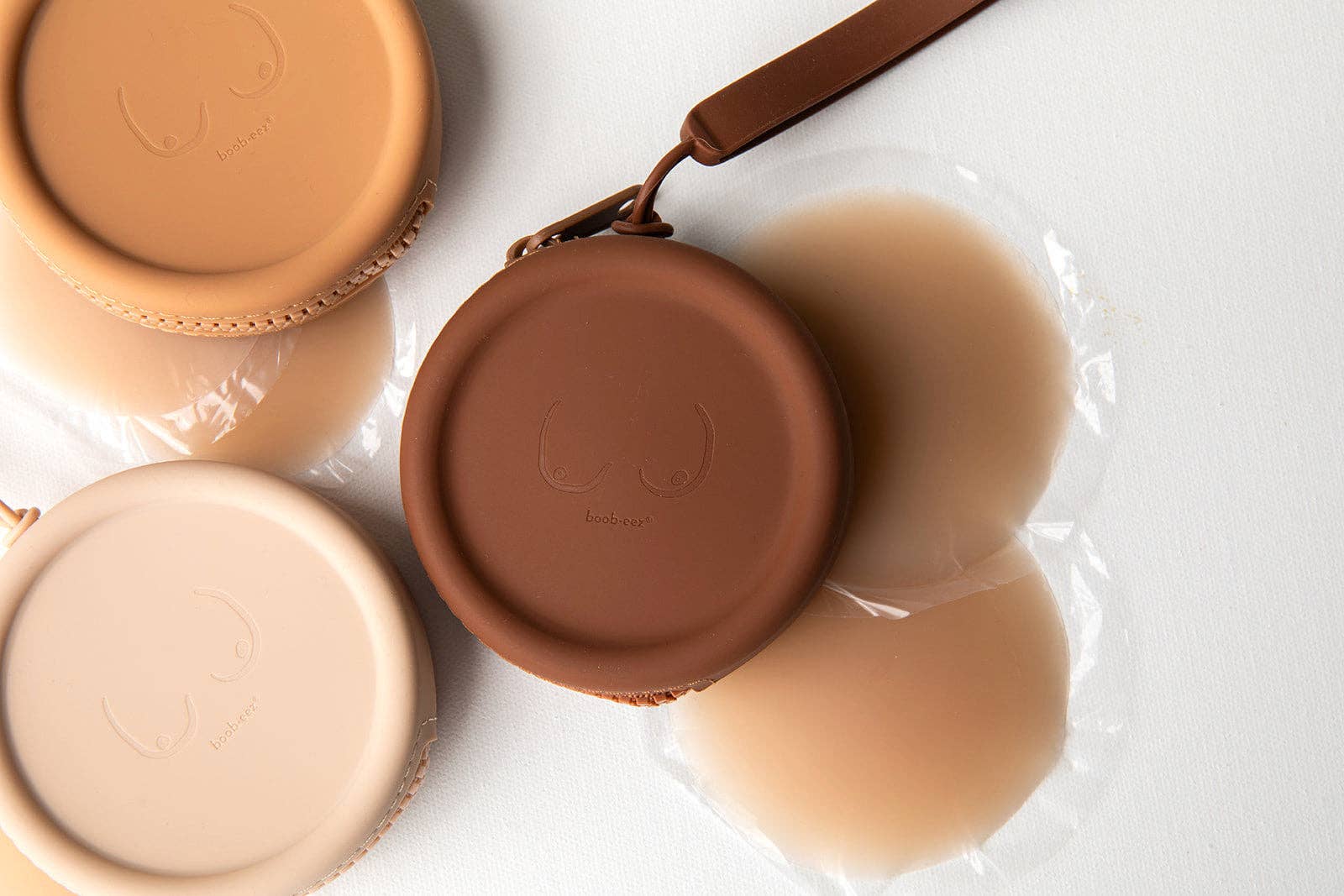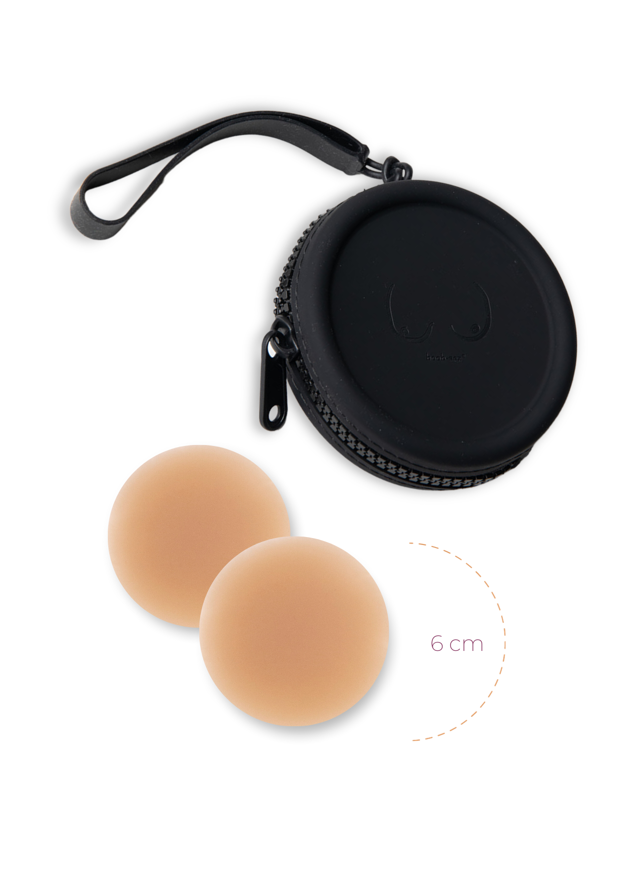 Deluxe Duo -- 1 pair of nipple covers + 1 silicone nipple cover travel case. Expand the lifetime of your pasties with this revolutionary combo: Boob-eez® #1 best-selling silicone nipple covers + a cute and durable travel case option made from kitchen-grade silicone! A safe and sustainable storage option for Boob-eez® Nipple Covers. Throw this travel case in your suitcase, purse, or backpack and take off on an adventure of a lifetime! These silicone travel cases come engraved with the Boob-eez® iconic logo, equipped with a removable wrist strap and zip closed with eez. Details: * Zipper closure * removable wrist strap. * Fits both sizes of our Boob-eez® "headlight" hiders (6cm & 8cm) * Washable and reusable with mild soap and water. Lay un-zipped to dry.