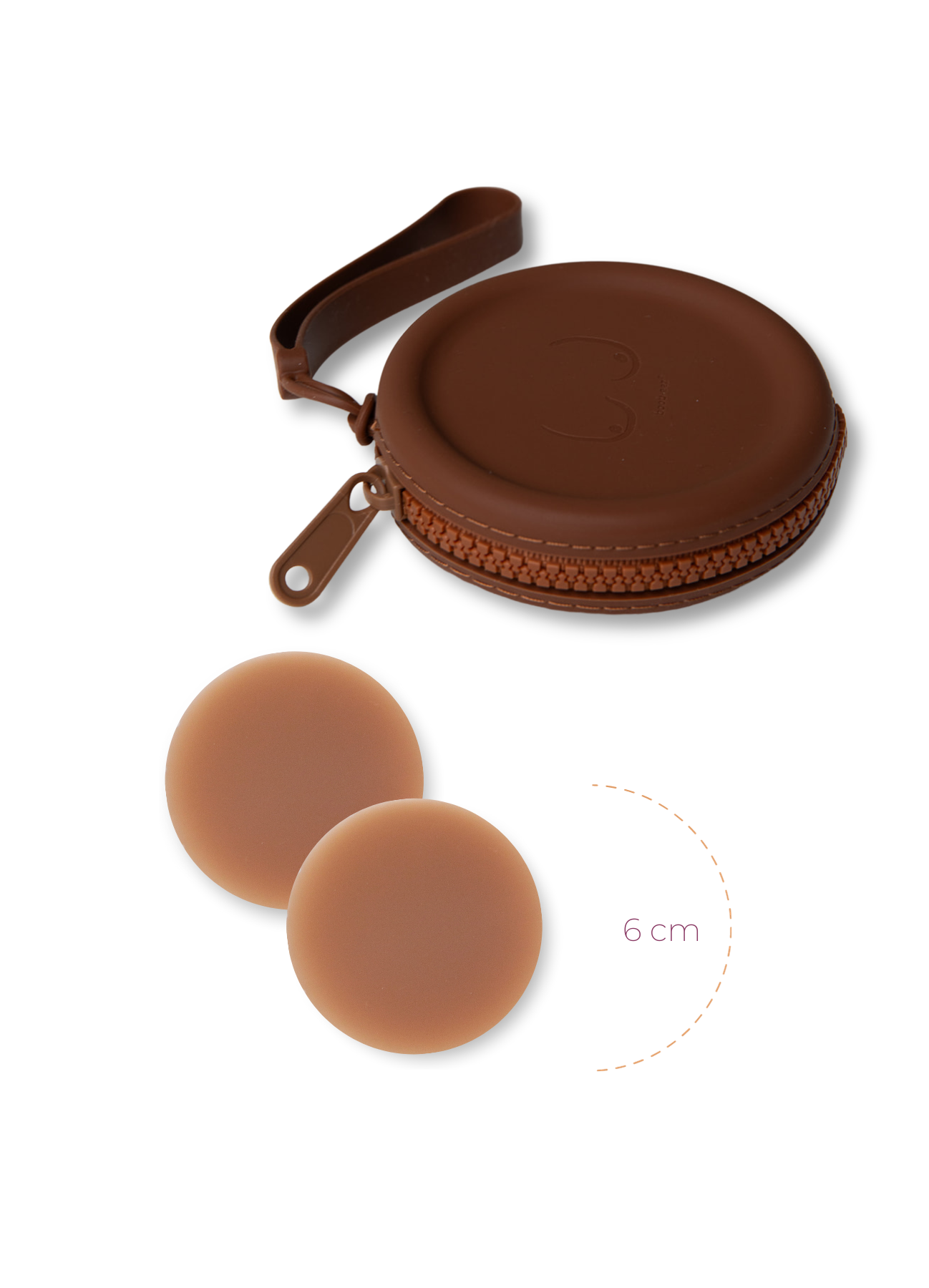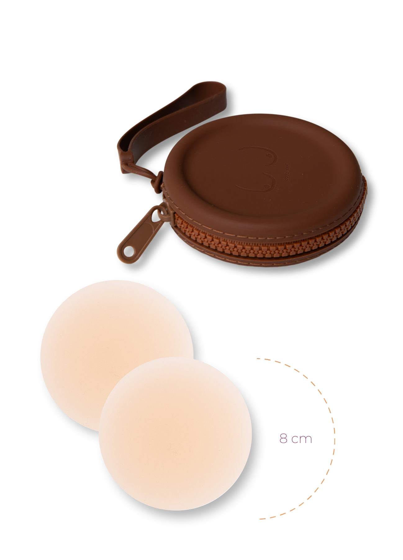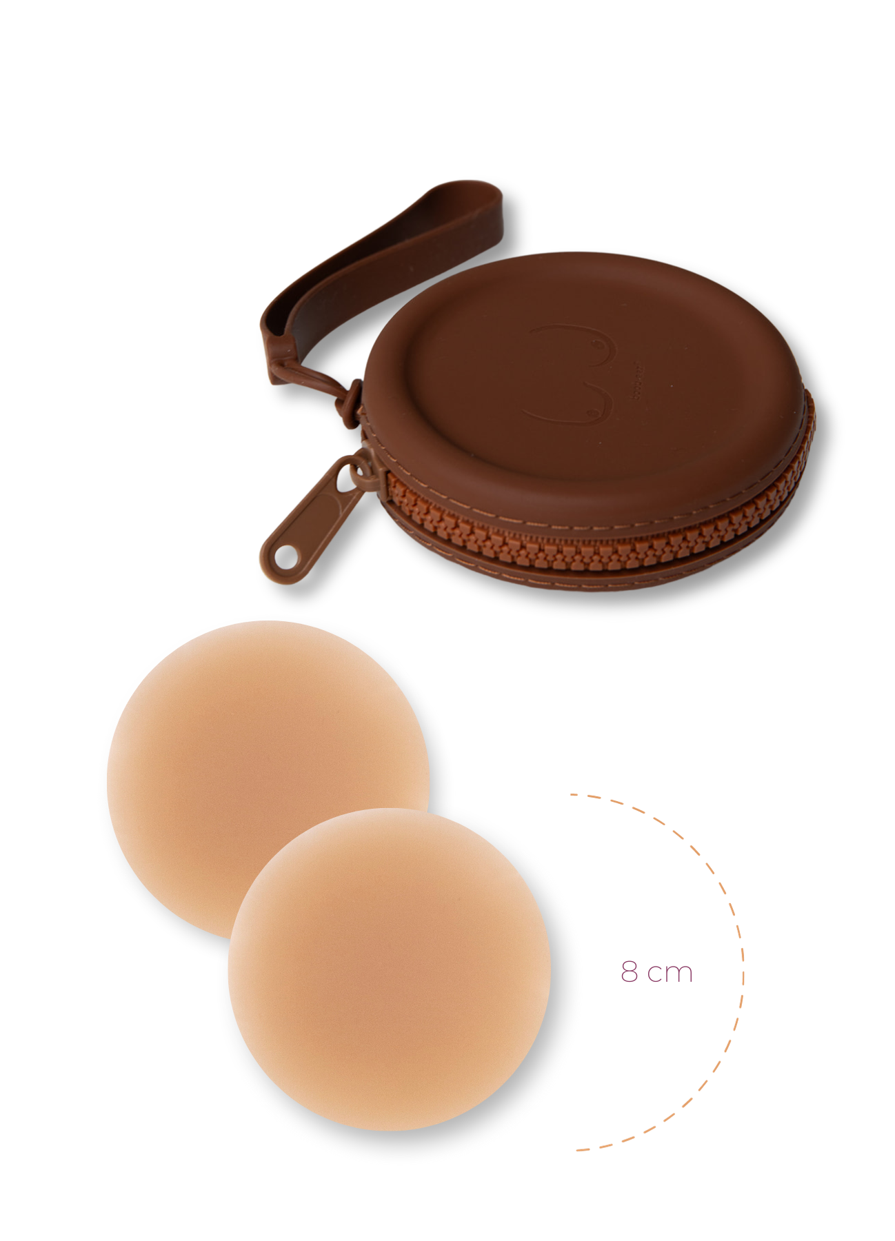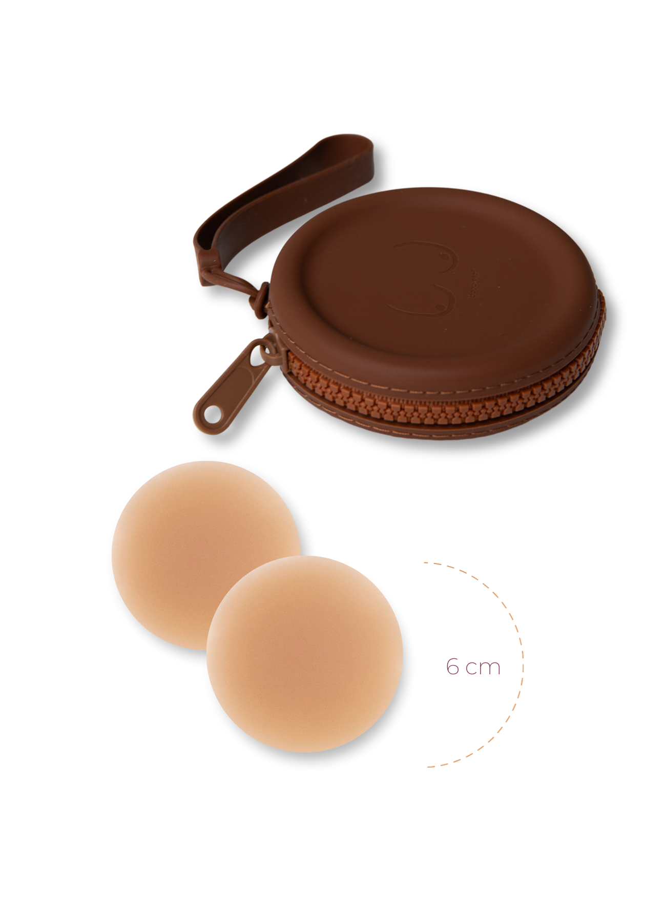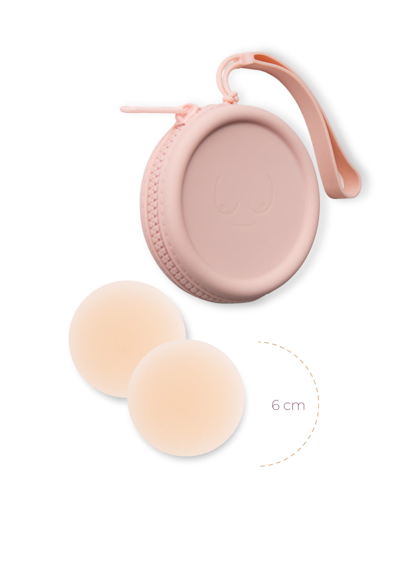 Deluxe Duo -- 1 pair of nipple covers + 1 silicone nipple cover travel case. Expand the lifetime of your pasties with this revolutionary combo: Boob-eez® #1 best-selling silicone nipple covers + a cute and durable travel case option made from kitchen-grade silicone! A safe and sustainable storage option for Boob-eez® Nipple Covers. Throw this travel case in your suitcase, purse, or backpack and take off on an adventure of a lifetime! These silicone travel cases come engraved with the Boob-eez® iconic logo, equipped with a removable wrist strap and zip closed with eez. Details: * Zipper closure * removable wrist strap. * Fits both sizes of our Boob-eez® "headlight" hiders (6cm & 8cm) * Washable and reusable with mild soap and water. Lay un-zipped to dry.
