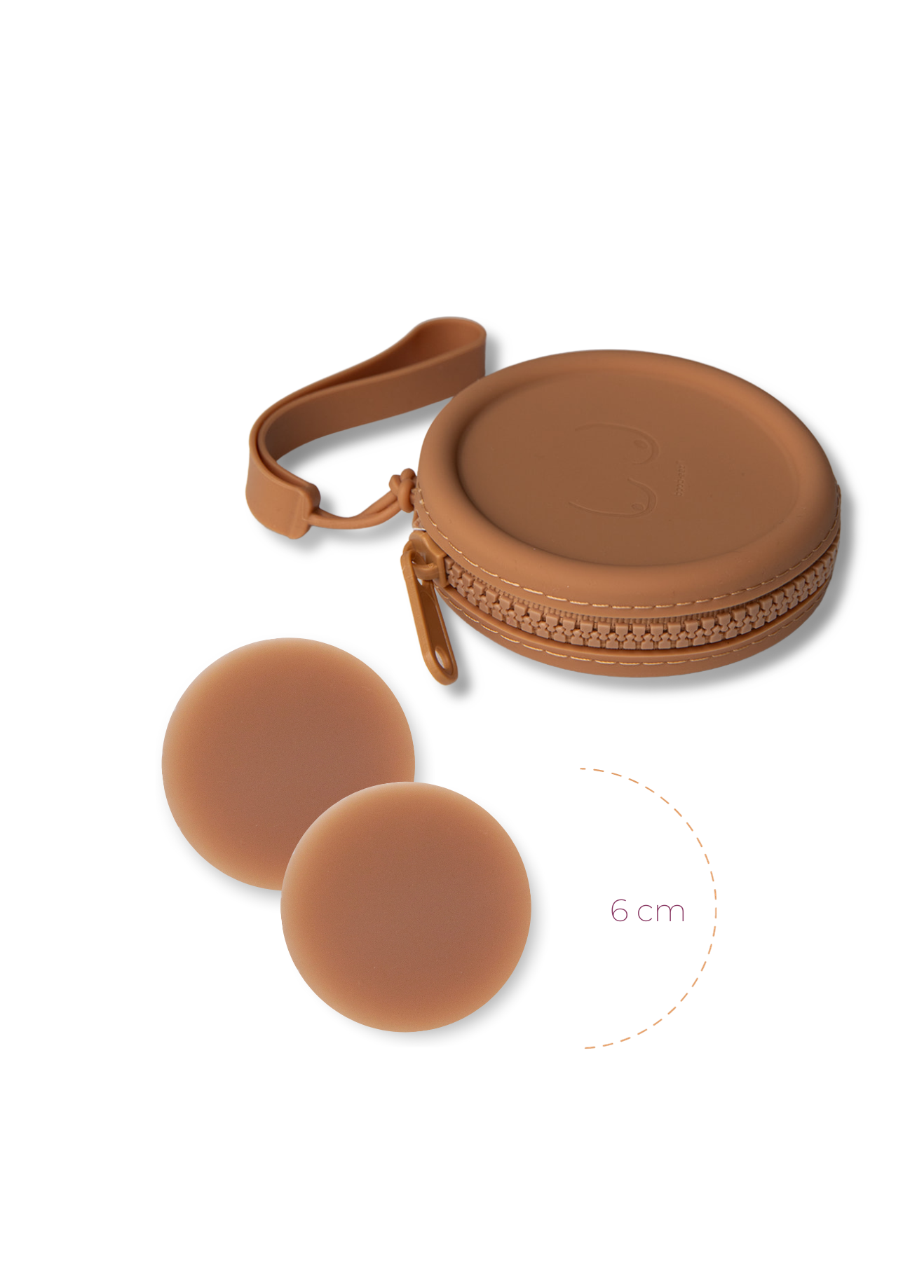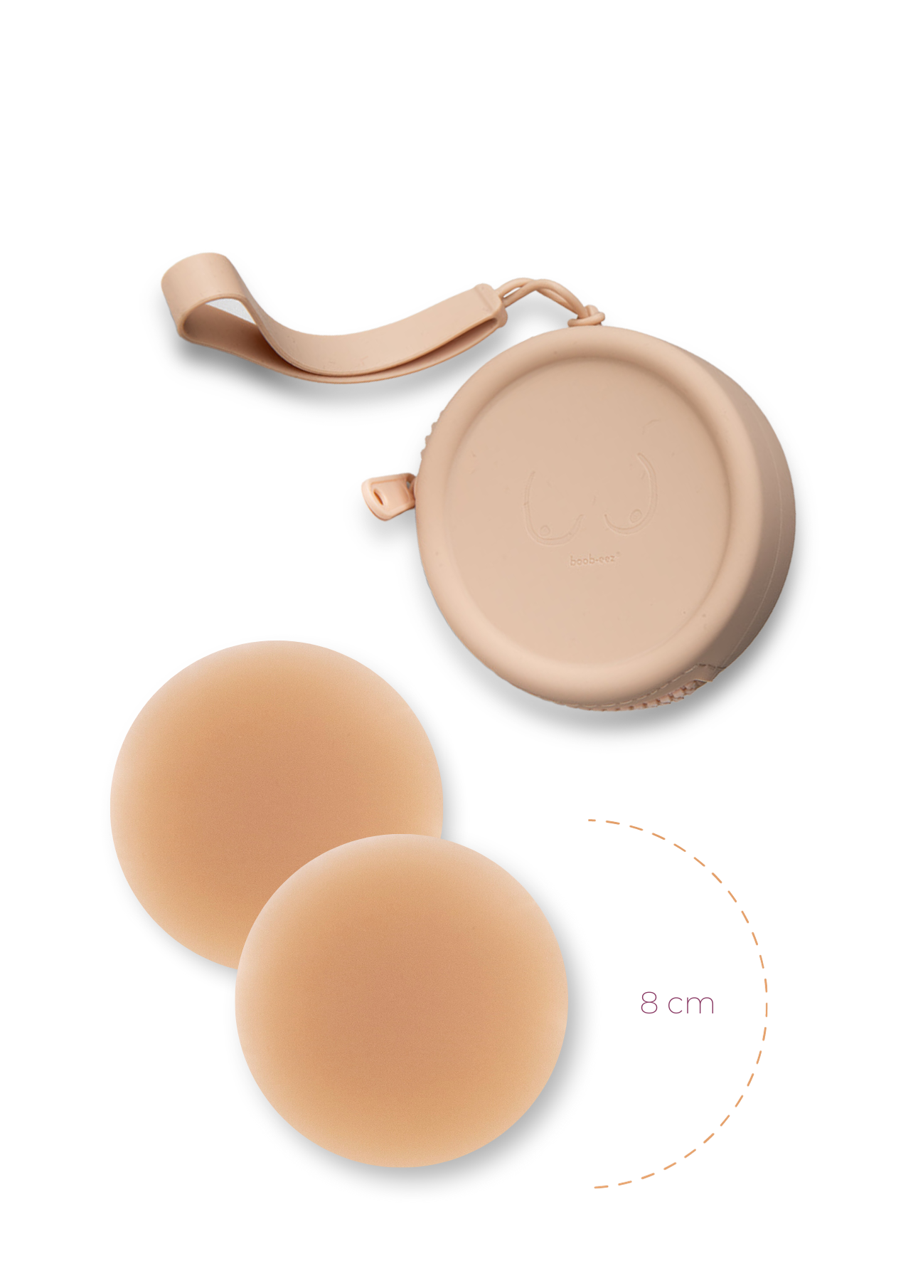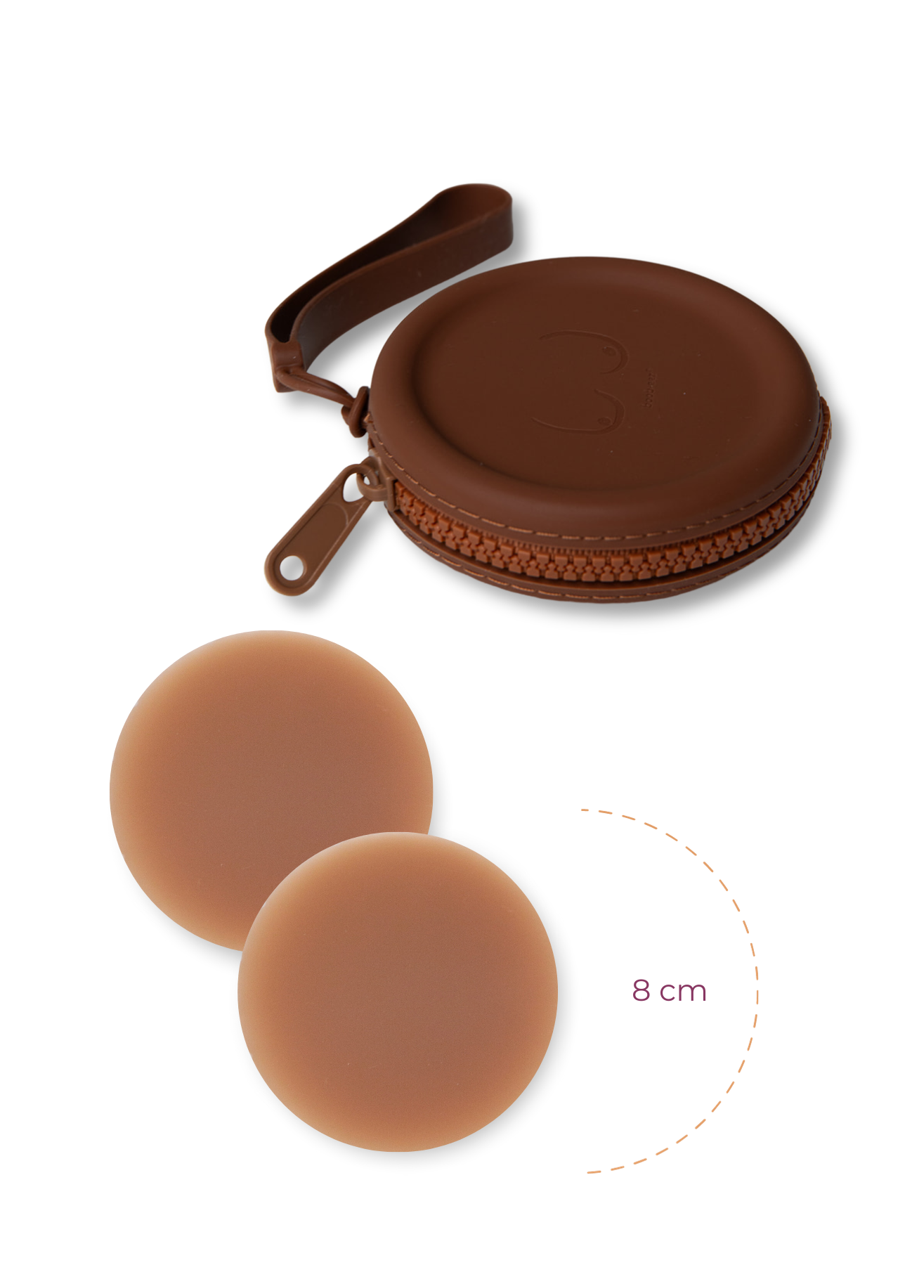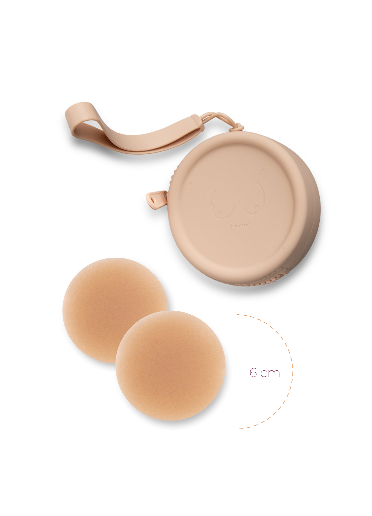 Deluxe Duo -- 1 pair of nipple covers + 1 silicone nipple cover travel case. Expand the lifetime of your pasties with this revolutionary combo: Boob-eez® #1 best-selling silicone nipple covers + a cute and durable travel case option made from kitchen-grade silicone! A safe and sustainable storage option for Boob-eez® Nipple Covers. Throw this travel case in your suitcase, purse, or backpack and take off on an adventure of a lifetime! These silicone travel cases come engraved with the Boob-eez® iconic logo, equipped with a removable wrist strap and zip closed with eez. Details: * Zipper closure * removable wrist strap. * Fits both sizes of our Boob-eez® "headlight" hiders (6cm & 8cm) * Washable and reusable with mild soap and water. Lay un-zipped to dry.